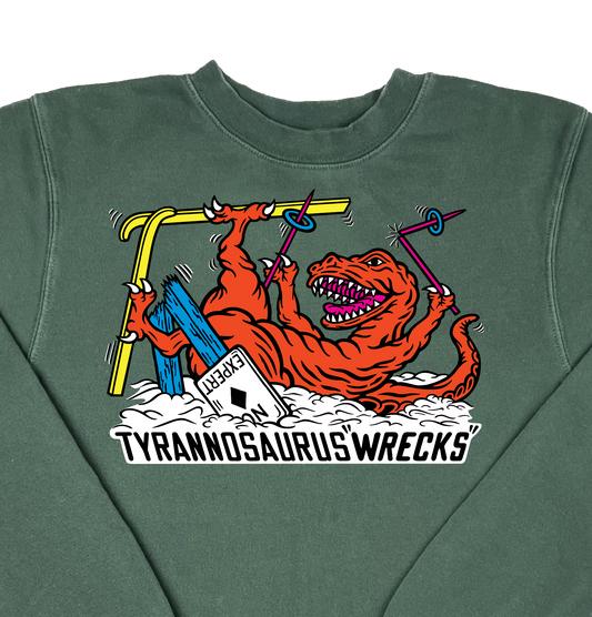 Skiing Tyrannosaurus rex Wrecks “Pigment Dyed” Crewneck Sweatshirt Dino Puns